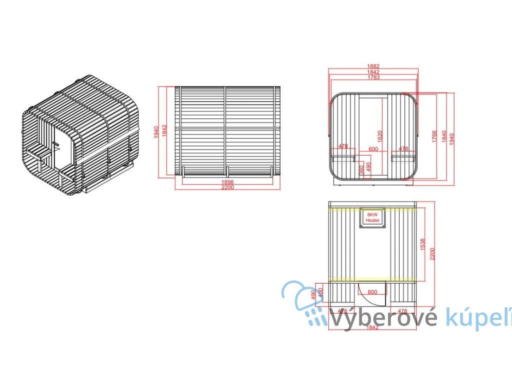 - Rozmery exteriéru: 188 × 220 × 194 cm