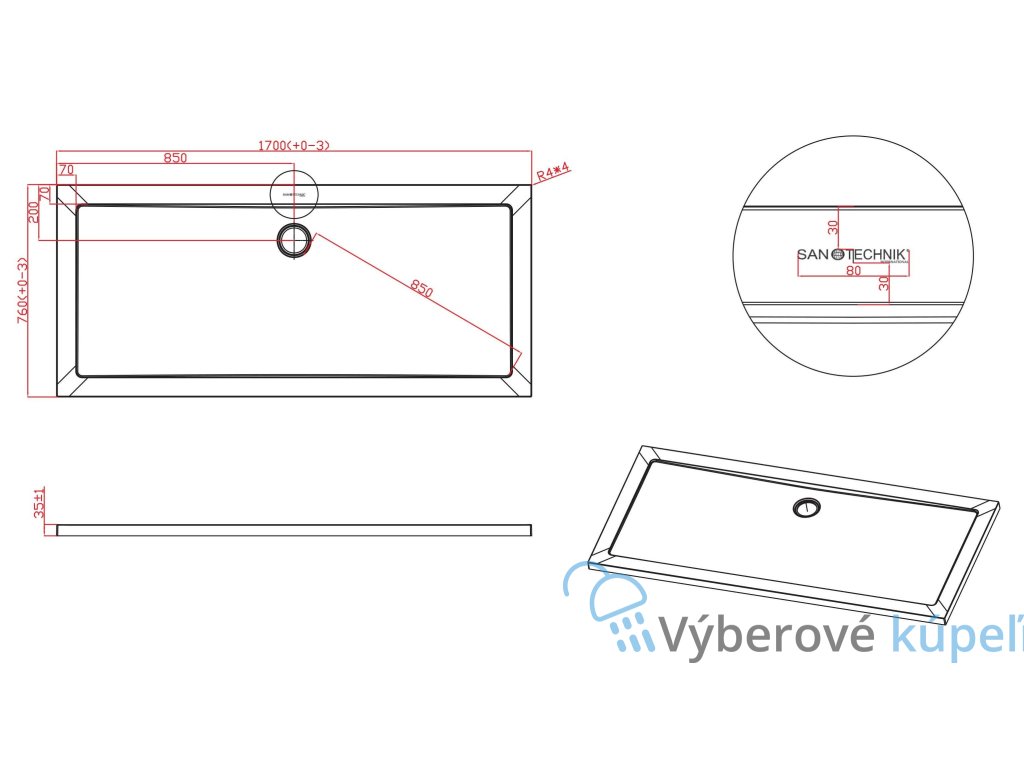 Sanotechnik sprchová vanička, SMC tvrdený polymér, obdĺžnik, 67x170cm, SC1776S